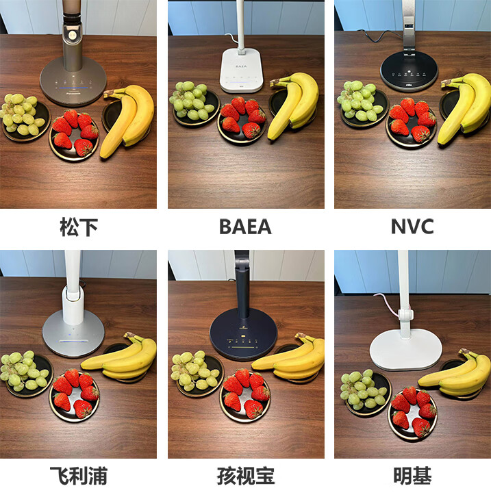 这部分我们采用色彩丰富的,草莓,香蕉,青提作为色源。在不同品牌的台灯下照射,看色彩还原情况。