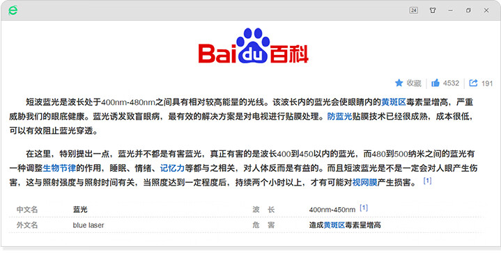 相信很多朋友都听说过蓝光对眼睛会有伤害,根据研究发现,波长处于400nm-450nm之间的蓝波长内的蓝光会使眼睛内的黄斑区毒素量增高,严重威胁我们的眼底健康。
